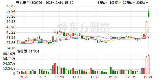 公告显示,宏达电子股票交易价格连续3个交易日收盘价格涨幅偏离值累计达到31%。根据有关规定,属于股票交易异常波动的情况。交易行情显示,截至12月24日收盘,公司股价收涨6.43%,收于56.25元/股。